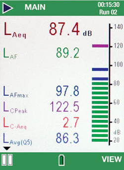 Die CEL-620 Serie nutzt die Farben der hochauflösenden Anzeige, um den Benutzer beim Durchführen der Messungen zu unterstützen. Die Anzeigen sind, je nach Betriebsart, farbkodiert. Zum Beispiel werden Kopf- und Fußzeilen auf dem Display während eines Messlaufs grün angezeigt (siehe rechts), wechseln nach dem Stopp der Messung aber auf rot, in Anlehnung an ‘rotes Licht’ und ‘grünes Licht’ bei Verkehrsampeln. Gemessene Parameter werden in verschiedenen Farben angezeigt und die Balkendiagramme werden zum besseren Verständnis der Lärmbelastung in den jeweiligen Farben der Parameter dargestellt.